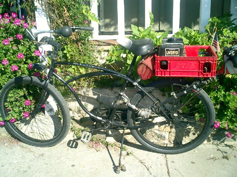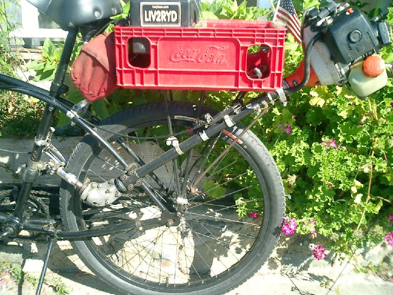 Terry McKean's "Wackercycle"Whilst travelling south on the Pacific Coast Highway (CA 1) in November of 2006, I happened to stop at the restaurant/deli/convenience store in fabulous Gorda, CA. Up rode this chap on his home-built "moped" and I snapped these photos. Sadly, I neglected to get a photo of Terry, the maker.